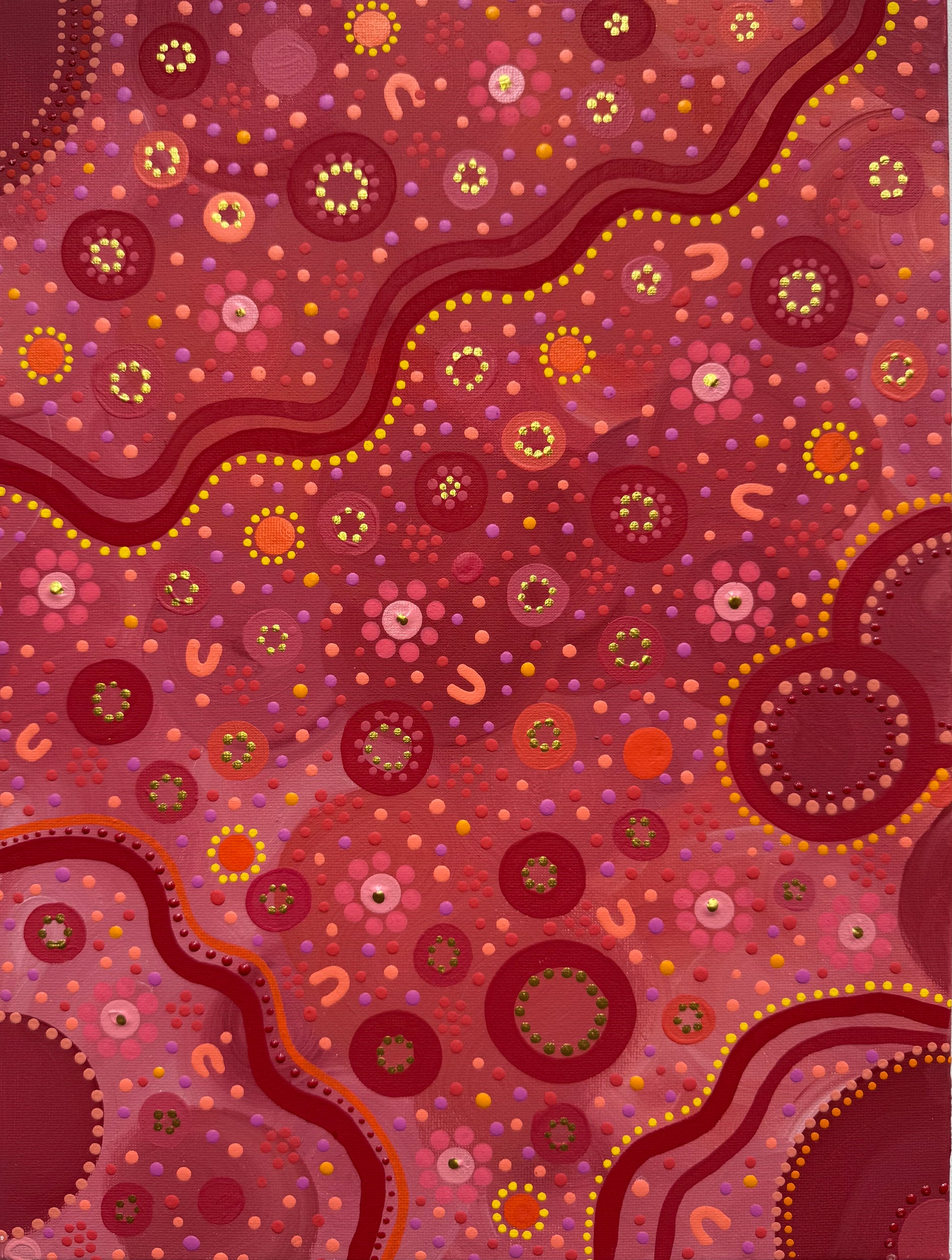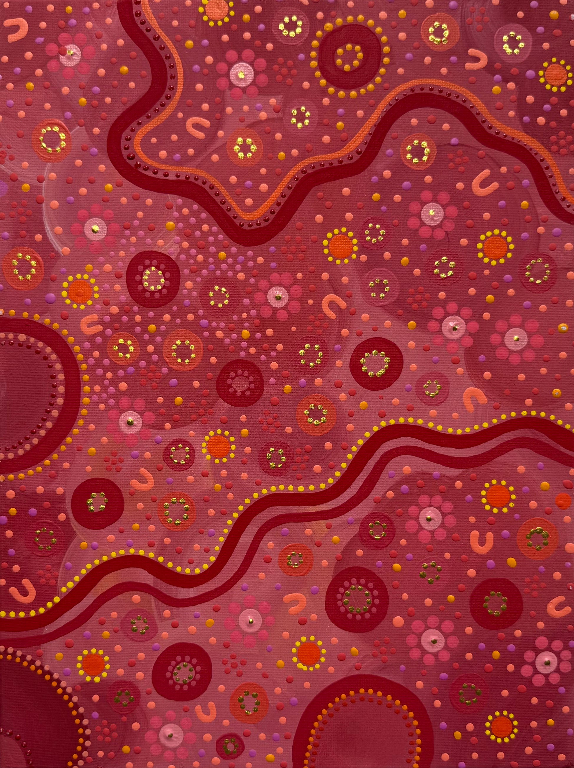 Created on high-quality stretched canvas (30 x 40cm), this one-of-a-kind piece brings warmth, meaning, and cultural storytelling into any space. Perfect for collectors, art lovers, or anyone looking to connect with the beauty and spirit of Aboriginal art.