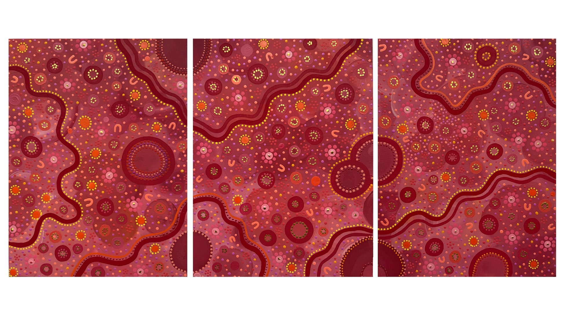 This three-piece artwork represents the strength of family and community. Flowing pathways connect each canvas, symbolising journeys that bring people together. Circles show gathering places for stories and culture, while earthy tones honour Country and vibrant colours celebrate love, memory, and resilience.