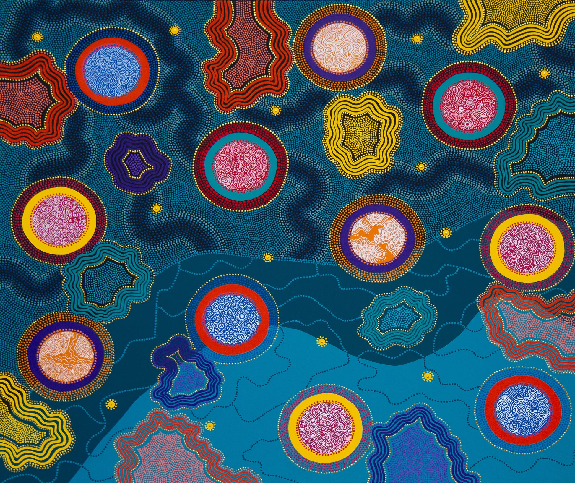 This artwork serves as a reminder that our lives are measured by memories, not by time. When a loved one passes, the memories of them continue to live on through all those lucky enough to have known them. Our lives are defined by memories and moments, not by the hours or years. The circles and ripples in this piece represent memories. Each circle tells little stories through Aboriginal symbols, while the ripples highlight the lasting impact these memories have on shaping who we are. Surrounding these memories are waves of grief. I've tried to capture the paradoxical journey of grief: the comfort found in cherished memories and the pain of being reminded of loss.